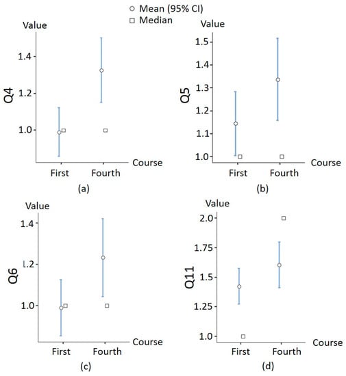 One may observe in Figure 5 that the medians are below the confidence intervals of the means between the first- and fourth-year results in almost all cases. This information should not be interpreted as a generalized increase in the sustainability competencies of fourth-year students corresponding to the questions analyzed, but rather that a minority of students have greatly increased their learning. Therefore, when the group as a whole is analyzed, a mean increase is not reflected in the median.