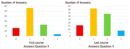 The comparison of the mean and median values enables us to form a better idea of how the responses are distributed. To view this distribution graphically, the distribution of the first- and fourth-course answers to each question in which the Mann-Whitney U test (or Student’s T) identifies significant improvements is presented.