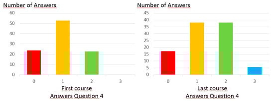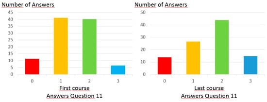 Cohen’s D is applied to each question (Q4, Q5, Q6 and Q11) to measure the effect size. The null hypothesis is that fourth-year learning is greater than first-year learning. The size of all measured effects is small. The largest effect size corresponds to Q4 (0.44). The effect size of Q5 is 0.24, that of Q6 is 0.30 and that of Q11 is 0.21. The fact that the effect size is positive shows that the results of the fourth year are statistically better than those of the first year.