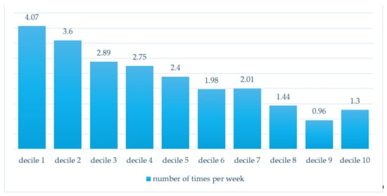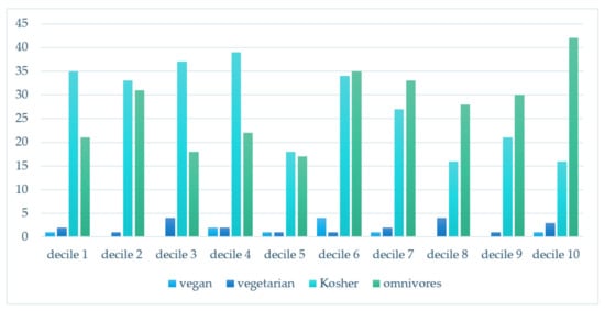 One possible explanation for different food consumption patterns might be cultural. Different religious groups, for example, presumably have contrasting dietary inclinations (omnivores, kosher, vegetarian, and vegan). Findings suggest, however, that the only significant difference in Israel between the various deciles is the observance of Jewish dietary (kosher) rules. Such socioeconomic distinctions associated with religious affiliation, can be attributed to the relatively large family size (and pervasive poverty) among Israel’s ultra-Orthodox community [] these findings are consistent with research that examines environmental awareness among Israel’s ultra-Orthodox society []. The research reveals that the economic level and the geographical density of the community are among the most significant variables affecting awareness. At the same time, there is a similar proportion of vegetarians and vegans found in all socioeconomic deciles. Figure 2 presents dietary patterns as reported by respondents in different socioeconomic deciles. It is interesting to note that over 30% of respondents in the poorer four deciles report observance of kosher dietary restriction, as opposed to 20% or less and in the top three deciles. For the other dietary regimes, as mentioned, no statistically significant differences were identified.