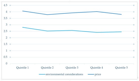 It is important to note that there appears to be no essential difference in the considerations for purchasing clothes reported among respondents in the different socioeconomic deciles. As emerging from Figure 4, respondents in all deciles rated price and appearance higher than environmental considerations in making their consumer decisions. These findings confirm the findings of the Israeli Ministry of Industry, Trade and Employment [], which found that in all deciles, product price constitutes the most important consideration in purchasing a consumer item, with environmental considerations among the least important considerations [].