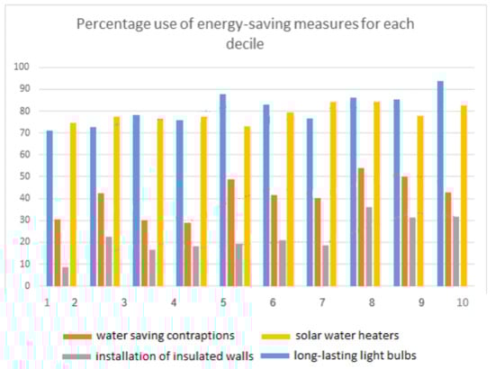 Figure 6 offers a clear representation of this trend. In the lower socioeconomic groups, installation of water-saving infrastructure is significantly lower than among the wealthier segments of society (36% versus 49%). More dramatically, only 8.4% and 7.4% respectively of the lower deciles report use of insulation and solar water heaters in their homes—in contrast to 31.7% and 84% among the wealthier deciles.