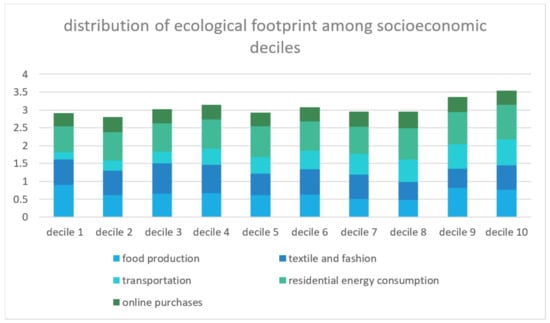 In evaluating the online purchase category, we found significant differences in the sizes of the footprint among the different deciles. Yet the findings did not conform to a clear socioeconomic trend. Accordingly, the second decile showed a significantly greater footprint than the third and fifth deciles. But the largest total ecological footprint was actually found in the eighth decile.
