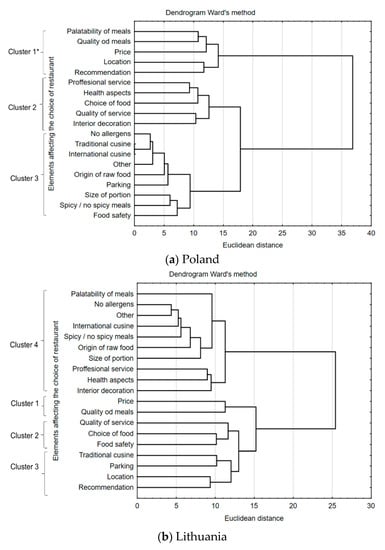 In case of sustainable approach practices used in restaurants, respondents had a choice of nine different options. The calculations using multivariate cluster analysis identified four groups of elements influencing consumer decisions in Poland, and three groups in Lithuania (Figure 2).