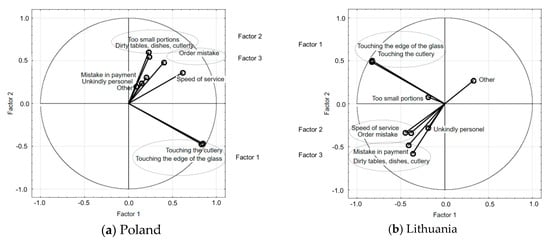 In order to determine the main factors conditioning service complaints in restaurants, as well as to determine the relationship between them, PCA calculations were performed (Figure 3). In both countries, three main groups of factors were identified. In both countries, the first main factor was the low proportion of complaints due to touching the edge of the glass and the cutlery with bare hands. However, the other two main factors differed depending on the assessed country. In Poland, the second main factor of concern was the cleanliness of tables, dishes, and cutlery, as well as size of the portions, while in Lithuania consumers were concerned by the long waiting time for a meal, and order mistakes. The third main factor was, in Poland, order mistakes and, in Lithuania, mistakes in payment and the cleanliness of tables, dishes, and cutlery. Other reasons for complaints have only slightly affected the opinion of consumers about the quality of service in restaurants. In both countries, there were only positive relationships between factors, i.e., the indicated reasons of complaints were mutually correlated.