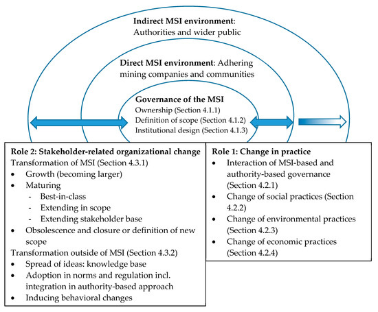1]). Furthermore, one could argue that motivation and integration of other actors and stakeholder groups in an MSI represent also some form of diffusion. The transformation effects outside of the MSIs are further detailed in the following section that discusses how MSIs may complement the authority-based governance of mining. Furthermore, directions for future research and limitations are presented.