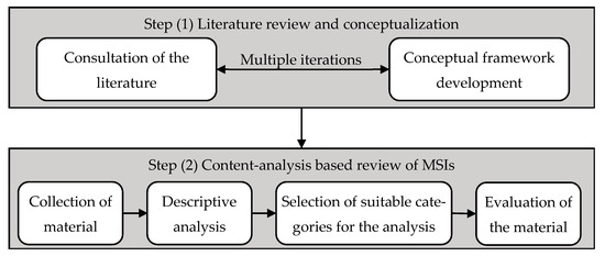This second step uses literature-based evidence to fill the parts of the framework and contribute to answering the research questions. This evidence is based on a review of the existing literature that integrates academic and practitioner literature alike to extend the knowledge on MSIs as social innovation and to deliver empirical evidence on the implementation of the social innovation. To realize this, the review is based on the content-analysis based literature analysis method proposed by Seuring and Gold [