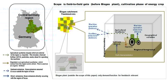 One potential solution to tackle the limitations of these previous studies has been the development of regionally contextualized life cycle concepts [] and modelling approaches [] to assess bioenergy production for an entire region. For such regional modelling, the functional unit is not an issue, as the regional cultivation of energy crops and energy generation are assessed in an integrative manner through the use of bioenergy catchments and spatial indicators. A recent study by O’Keeffe et al. [] has used the RELCA (a REgional Life Cycle inventory Assessment) approach [] to model the greenhouse gas mitigation potential of 425 biogas plants and their energy crop catchments operating in the region of Central Germany (CG). With their integrative approach, they identified the need to examine in more detail the effects of feedstock mixtures being used within biogas catchments and the locational factors which influence the cultivation emissions of energy crops and hence the GHG mitigation potential of regional biogas systems.