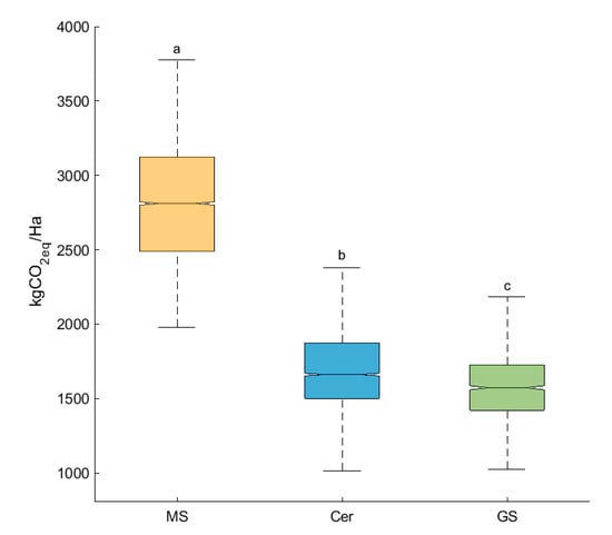 The RELCA simulated median CultiEmis for MS was found to be significantly higher (median = 2708 kgCO2eq/ha) than the median CultiEmis found for Cer and GS, of 1662 kgCO2eq/ha and 1573 kg CO2eq/ha, respectively (Figure 2). These results are comparable to the literature, for which higher GHG emissions associated with MS cultivation for biogas has already been shown, in comparison with grass silage [], sugar beet [], and cereals []. Although the ranges and aspects included in such studies varies widely.