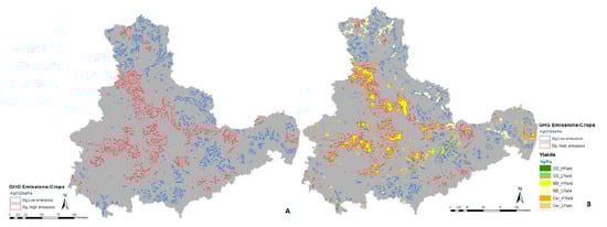 The regional distribution of statistically high (red) and statistically low (blue) (A) GHG emissions associated with cultivation energy crops (kgCO2eq/ha), (B) high (HYield) and low yields (LYield) for all crops (MS, Ger, GS) associated with the simulated biogas catchments for the CG region. To support the visual representation, grid cells were aggregated using the ESRI ArcGIS polygon aggregate tool using a 2 km radius.