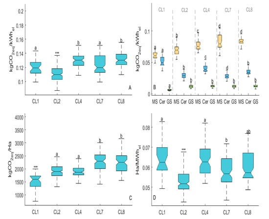 Slurry dominant biogas plants found in the CG region the simulated profiles for: (A) Cultivation GHG emissions (kgCO2eq /kWhel), (B) the corresponding emission profiles for the summed areas of the feedstock mixes associated with each cluster (kgCO2eq /kWhel), (C) Median emission intensities (EI) associated with the constituent biogas plants of each cluster (kgCO2eq/ha), (D) LAD (land area demand) for constituent biogas plants associated with each cluster (ha /MWhel) Clusters with the same letters are not significantly different from one another. Clusters denoted with “***” are significantly different from every other cluster (at the 5% level). Extreme outliers were excluded.