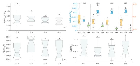 For Bcats associated with SLdom clusters, the cultivation of energy crops contributed between 52–56% of the total emissions []. The GHGculti ranged from 0.086 to 0.137 kgCO2eq/kWhel. Based on MS shares in the crop mix, we would expect GHGCulti (high to low median) to be as follows: CL8 > CL4 > CL7 > CL2 > CL1. However, we get the following order of: CL4 > CL8 > CL7 > CL1 > CL2, with Bcats associated with CL2 having the significantly lower GHGculti (Figure 4A).