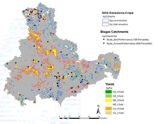 The distribution of biogas catchments which were found to have significantly high and low (at 5% level) GHGCulti emissions overlaid on the geographical data presented in Figure 3.