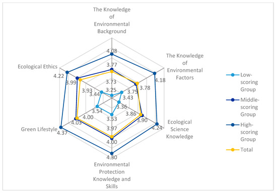 It can be seen that participants in the high and middle groups have a higher preference for “ecological science knowledge”, while those in the low group have a higher preference for “the knowledge of environmental factors” and “environmental ethics”. It can be seen that participants in the higher group prefer to learn systematic knowledge more than those in the lower group. This is reflected by those in the higher group preferring to learn “ecological science knowledge”, including ecological systems and processes, while those in the lower group prefer to learn “environmental factor knowledge”, including animals, plants, geology, and landforms. This situation may be explained by the theory of developmental psychology. People who are older and have more social roles are able to deal with problems with more systematic thinking when facing complex and diverse social environments [62,63,64]. Therefore, participants in the high-scoring group with rich social experience have developed the habit of dealing with problems in a more systematic and comprehensive way [65]. Therefore, this group tends to prefer the “ecological science knowledge” category of environmental education. Most of the participants in the lower group are students and young people who have just entered society (in China, teenagers and young people are less independent [66,67]), with less economic pressure and family responsibility, they have rich imagination and creativity, and hope to change the world [68]. Therefore, young people are more eager and energetic to pay attention to the “environmental ethics”, such as international environmental issues and human–natural relations that have little to do with real life.