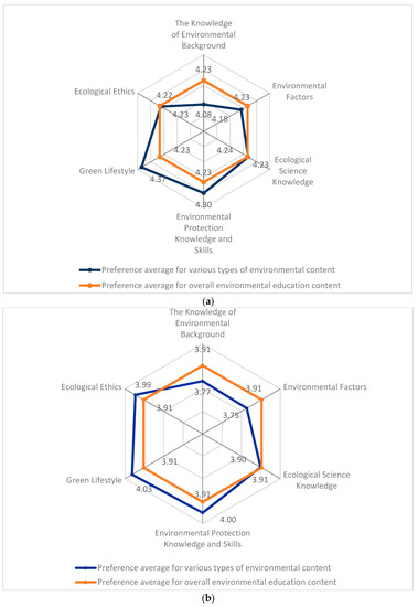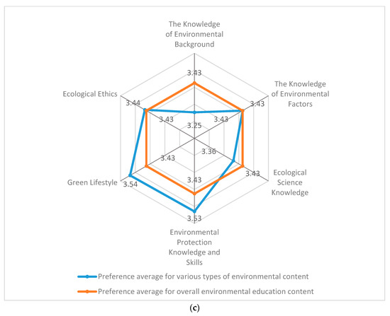 As for the preference for environmental education content, the preference degree of participants in the high-scoring group for “green lifestyle”, “environmental protection knowledge and skills”, and “ecological science knowledge” was greater than the mean value of the overall preference for environmental education content (M = 4.23) (see Figure 2a). The preference degree of participants in the medium-scoring group for “green lifestyle”, “environmental protection knowledge and skills”, and “ecological science knowledge” was greater than the mean value of the overall preference for environmental education content (M = 3.91) (see Figure 2b). The preference degree of participants in the lower scoring group for “green lifestyle”, “environmental protection knowledge and skills”, “environmental ethics”, and “the knowledge of environmental factors” was greater than the mean value of the overall preference for environmental education content (M = 3.43) (see Figure 2c).