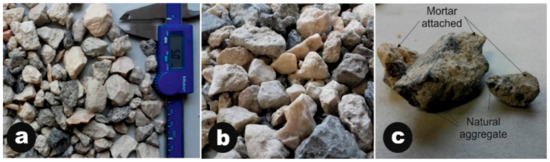 (a) and (b) Recycled aggregate from the construction and demolition used in this research; (c) detail of the attached mortar to the natural aggregate.