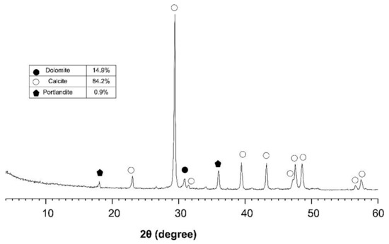 It can be seen (Figure 3) that the main phase detected in the RCA was calcite (84.2%) followed by dolomite (14.9%)—both minerals are identified commonly in concretes whose natural aggregates used in their production are from limestone origin. In addition, Figure 3 shows Portland cement content with 0.9% Portlandite, which shows the existence of free calcium hydroxide, typical of non-carbonate concretes. It is also noted that the sample of the analyzed residue has a homogeneous chemical composition and does not present any type of contaminant. Table 4 shows the chemical composition of the RCA used, where it can be seen that the predominant chemical compound is calcium, a major element in both the limestone aggregate and the cement paste surrounding the RCA.