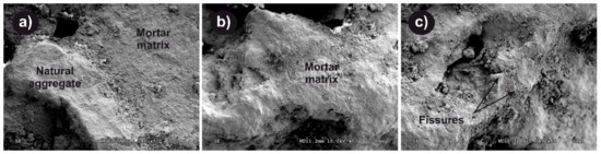 The RCA sample was examined with a scanning electron microscope (SEM) (Figure 4) using a Hitachi S3000N. For the morphological analysis, small fragments of the aggregate were obtained and dried in an oven at 60 °C to avoid altering the sample. Once dry, the small fragments were metallized (30 nm layer) with Au-Pd in Argon atmosphere to increase the quality of the images. The properties of the interfacial transition zone (ITZ) have a significant impact on the macro mechanical properties. As can be seen in Figure 4, these transition zones are subject to fissures, and may affect the mechanical characteristics.