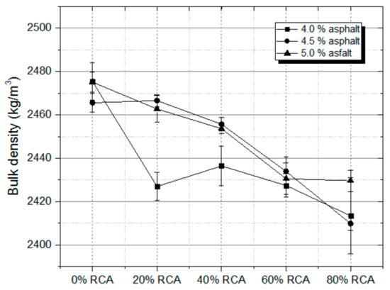 Average bulk density of the bituminous mixtures manufactured with different percentages of RCA and different percentages of asphalt content. The error bars represent the standard deviation.