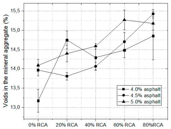 Voids in the mineral aggregate determined in the bituminous mixtures manufactured with different percentages of RCA and different asphalt content. The error bars represent the standard deviation.