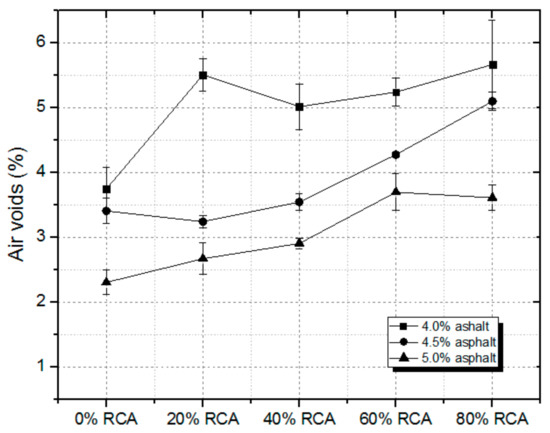 Air voids in the bituminous mixes manufactured with different percentages of RCA and different asphalt content. The error bars represent the standard deviation.