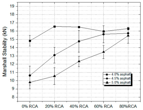 Marshall stability of the bituminous mixtures manufactured with different percentages of RCA and different asphalt content. The error bars represent the standard deviation.