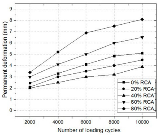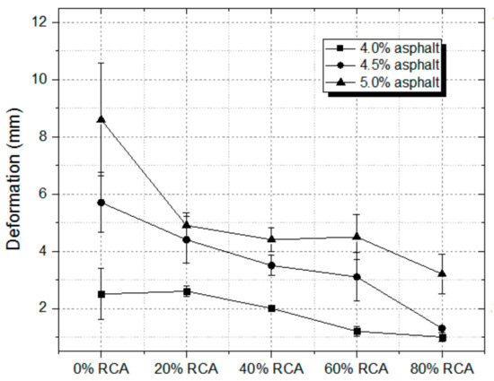Figure 9 shows that deformation measured decreased when the RCA content increased. This was due to the cement adhering to the RCA and its self-cementing property that makes the mixtures less deformable, as is the case in researches [34,36]. Furthermore, an increase of the mixtures deformations was observed when increased asphalt content because the mixtures was more deformable.