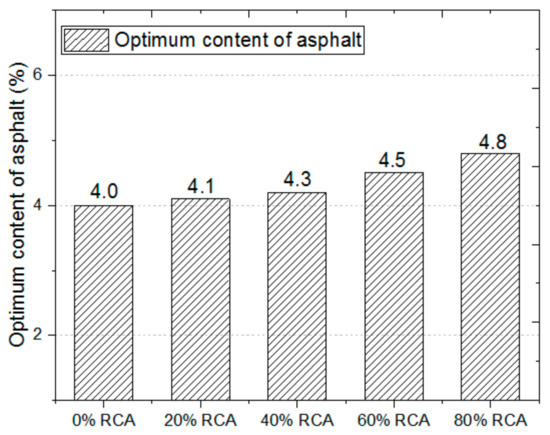 A high number of researchers have the criterion of increasing the optimal asphalt content (OAC) with the use of RCA in asphalt mixtures [22,24,26,32,37]. The mortar adhered to the NA [39,40] is more porous and less dense than the original aggregate, and seems to be responsible for the loss of RCA quality [22,24,36].