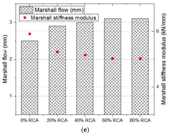 It can also be seen that the Marshall stability (Figure 11d) increased with the RCA content. As mentioned, this was due to the self-cementing properties of the RCA. The mortar adhered to the surface provoked an increase in deformations (as can be observed in Figure 11e), because it makes difficult the proper adhesion between the asphalt and the RCA [33] and, as a consequence, provokes less load absorption and therefore an increase of the deformations in the mixtures.
