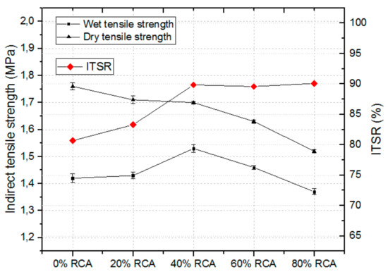 As can be seen in Figure 12, an increase in the ITSR was determined in the mixtures when RCA content increases in the mixtures manufactured, complying with the technical specifications established in the Spanish recommendations (ITSR ≥ 85%) [49]. This behavior is also observed in other research [37,56]. The ITSR increase is due to the addition of RCA, which is accompanied by an increase in the OAC as noted previously (Figure 10). As can be seen in Figure 12, there was decrease in the indirect tensile strength when the RCA increased as a consequence of the cement adhering to the original aggregate. The cement attached causes a loss of adhesion between the RCA and the asphalt. However, the indirect tensile strength after immersion increased with the content of RCA up to 40%. This is caused by the contact of the cement attached in the RCA with the water that activates its self-cement properties. The adhesion between RCA and asphalt is not affected in this condition [57]. The indirect tensile strength in wet conditions of the mixtures with 60% and 80% of RCA content decreases below the control mixture. This might be due to the instability of these mixtures caused by the RCA abrasion when they were manufactured during the mixing and compaction processes [33].