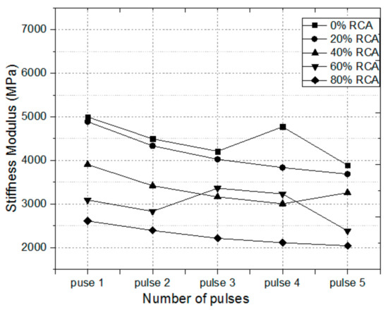 According the Spanish recommendations, the stiffness modulus of the mixtures should be between 2500 and 8000 MPa at 25 °C [49]; and according Comunidad Valenciana recommendations [58] it is stated that, for this type of mixture, the stiffness modulus should be between 3500 and 9500 MPa. As can be seen in Figure 13, all mixtures met the Spanish recommendation, while only the mixtures with 0%, 20% and 40% RCA content met the Comunidad Valenciana recommendations. In Figure 13, it is clear that as the percentage of RCA in the mixtures increases, the stiffness modulus of the mixtures decreases, this is attributed to the fragility of the mortar adhering to the RCA, in addition to the increase in the demand for binder (Figure 10) that the mixtures with RCA perceive. The same tendency was observed in the Marshall modulus (Figure 11e) and as has happened in research [24,32]. The same tendency is observed when the load cycles increases as expected [59]. According to ANOVA, the RCA content has a significant influence on the stiffness modulus of the mixture (p-value = 9.4088E-8).
