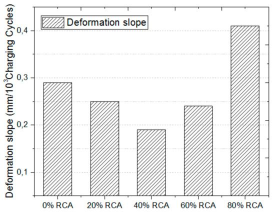 Partial replacement of natural aggregate by RCA does not significantly affect the rutting resistance of asphalt mixtures. As can be observed in Figure 14 and Figure 15, there was a slight reduction of the deformation slope when RCA content increase from 0% to 40%. The RCA structure and texture, i.e., its rough surfaces and sharp edges (Figure 4b), which are the result of being crushed multiple times, increased the specific surface area and friction between aggregate particles and helped to improve resistance to permanent deformation [4], as reported in scientific literature [31,60]. However, in the mixtures with higher RCA content (60% and 80%), the deformation slope and the rutting depth increased, as reported in [32], probably due to the combined effects of an increased asphalt content and RCA led to a slightly higher permanent deformation, exceeding the limit of 5 mm recommended in PG-3 [49] and reported in [4].