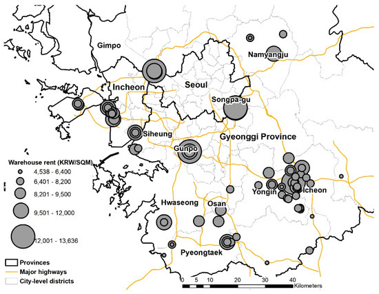 Figure 1. Spatial distribution of warehouse rents in the Seoul Metropolitan Area (SMA).