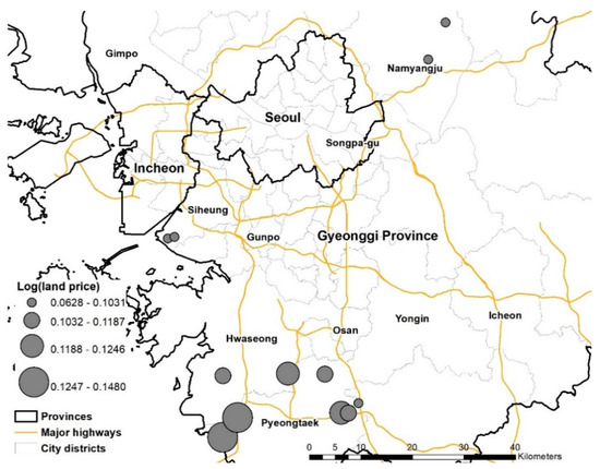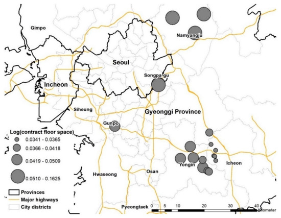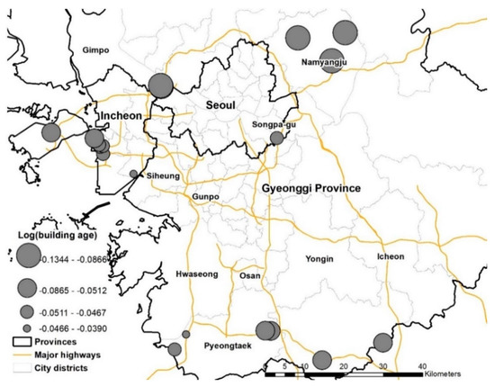 The increase in rental prices for smaller warehouses was more severe in Namyangju because of the limited number of large warehouses in the area (Figure 3). The negative effect of building age on warehouse rent was more severe in northern Gyeonggi Province, such as Namyangju and Gimpo than the rest of the SMA (Figure 4). In fact, a mixture of warehouse buildings was found with large differences in building age and rent in the close vicinity, implying the presence of higher demand for newer warehouses in such areas. If a new warehouse cannot be built, the existing old warehouses can be renovated and upgraded to satisfy such needs. The positive effect of land price on warehouse rent was highest in the southwestern Gyeonggi Province especially in Pyeongtaek near the industrial complexes of manufacturing facilities indicating a high demand for storage spaces for the local manufacturing industry (Figure 5).