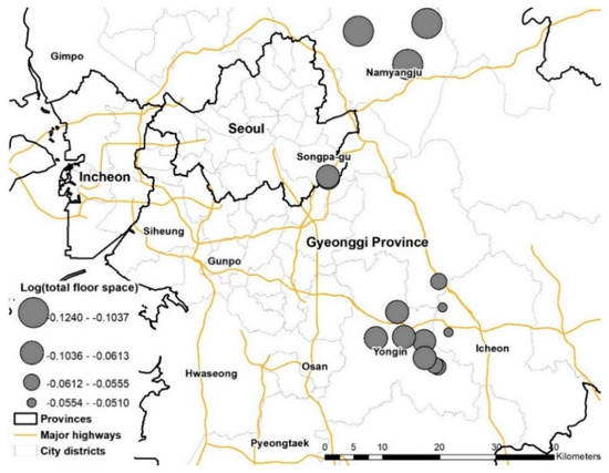 As shown in Figure 3, total floor space is negatively correlated with warehouse rent ranging from −0.1240 to −0.0554 depending on location. The smallest (most negative) coefficients are found in Namyangju located close to the northeastern part of Seoul. This suggests that rent tends to be higher in smaller warehouses because storage spaces available for rent are less available in smaller warehouses. This tendency is more severe in Namyangju than in the rest of the warehouse locations in the SMA.