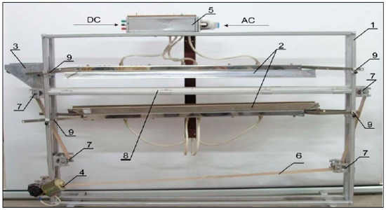 Laboratory device for infrared treatment of granular plant raw materials: DC - direct current, AC - alternating current, 1—frame, 2—infrared radiators, 3—feeding tank, 4—DC motor, 5—control unit, 6—conveyor belt, 7—rollers, 8—heating zone, 9—adjustment of the position of the heads.