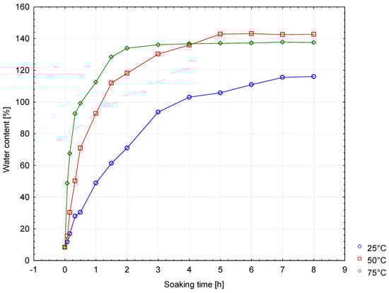 In the initial soaking period, the lentil seeds exhibited the lowest water absorption rate at the temperature of 25 °C. An increase in the temperature to 50 °C and then 75 °C resulted in an increase in this parameter. After 3 h of soaking at 75 °C, the lentil seeds reached a maximum moisture level of 138%. Seeds soaked at the temperature of 50 °C absorbed water at a slower rate and reached the maximum level later, but this was by 4% higher than the value obtained at 75 °C. These results are in agreement with the findings presented by other authors. Quicazán et al. [8] reported a slightly higher level of water in seeds soaked at a temperature of 40 °C than the water content in seeds soaked at 80 °C. This phenomenon may be associated with the more intensive denaturation of proteins at a higher temperature, which in turn may reduce the final capacity of water absorption in lentil seeds.