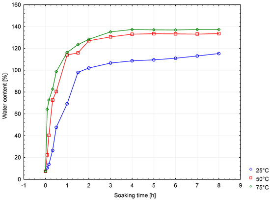 Water absorption by plant raw materials is influenced by both the process parameters (e.g., temperature, pressure) and the physical and chemical properties of the raw materials. The impact of the temperature of the soaking process on the rate and amount of absorbed water was investigated by, for example, Maskan [1] and Turhan et al. [2]. Their results clearly demonstrate the role of temperature (in the range from 6 to 100 °C) in the water absorption process. An elevated temperature was found to accelerate the water absorption rate in the case of peas, wheat, lupine, soybean, and faba bean.