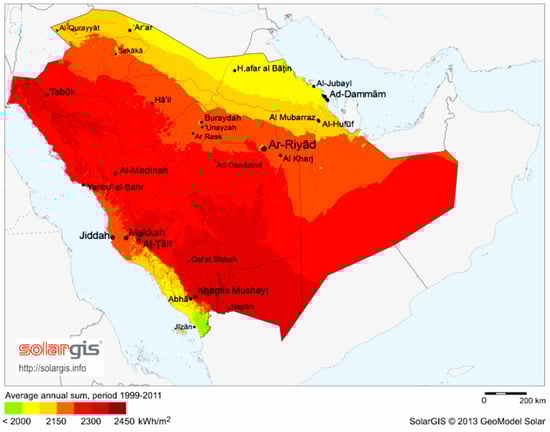 The building sector is responsible for almost 80% of electrical energy consumption in the country, with over 50% attributed to residential buildings []. Therefore, the presence of alternative energy solutions in the domestic sector is of the utmost importance. Solar energy is one of the best solutions to overcome the issue of electric energy demand growth []. Since Saudi Arabia possesses a large potential for solar energy, a considerable share of its energy needs may be harvested from solar energy. Saudi Arabia’s high solar irradiation availability, significant rainless areas, and long daylight hours make th country among the most suitable countries for the utilization and deployment of solar energy resources on a large-scale basis. The annual average irradiation in the countries with highest radiation potential ranges between 100–200 W/m2. Saudi Arabia, however, has an annual solar radiation reaching 250 W/m2, outpacing many other countries. In addition, Saudi Arabia has the advantage of long average hours of sunshine per day (8.53 h), vast expanses of free lands, and a cloud-free atmosphere []. These factors make Saudi Arabia a very favorable environment for the use of solar PV technologies. Figure 1 shows the global horizontal solar irradiation in Saudi Arabia [].
