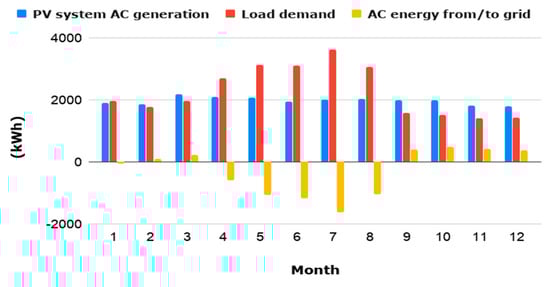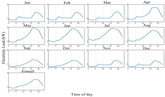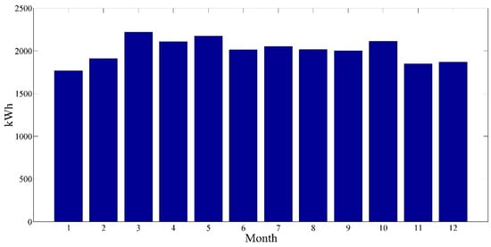 The monthly energy consumption for one apartment obtained from actual utility bills is shown in Table 1. In the summer season from May to August, energy consumption appears to be relatively high due to the extensive use of air conditioners. The annual average consumption is 160 kWh/m2/year, which is reasonable when compared to the 116 kWh/m2/year, 202 kWh/m2/year, 176.5 kWh/m2/year, and 141.69 kWh/m2/year reported in [,,,]. The system advisor model uses the monthly total electricity consumption to estimate the monthly and annual load profiles shown in Figure 2. This load profile is very similar to the load pattern in Saudi Arabia reported in [].