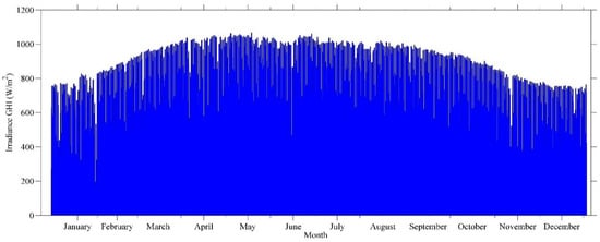 The weather data used in this study are the average data taken between 2003 and 2017 from King Abdulaziz International Airport Metrology Station (Station ID: 410240) and was retrieved from the European Commission Joint Research Centre database website. Jeddah has high solar radiation potential, ranging between 4.5 and 7.9 kWh/m2/day, with annual averaged daily global solar radiation of 6.35 kWh/m2/day on a horizontal surface. Based on the data obtained, the Global Horizontal Irradiance (GHI), ambient temperature time series data, and the monthly averaged daily global solar radiation are presented in Figure 4, Figure 5 and Figure 6 respectively [].