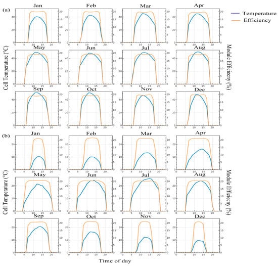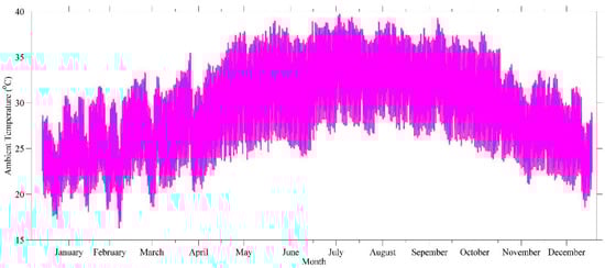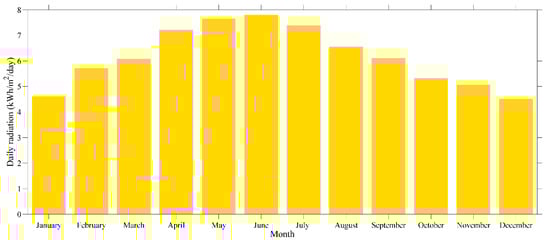 Solar irradiance and ambient temperature are crucial factors that influence a PV system’s output. Thus, the daily average solar radiation and daily average ambient temperature are the key inputs to estimate the system’s size and output. The PV module’s output power is []