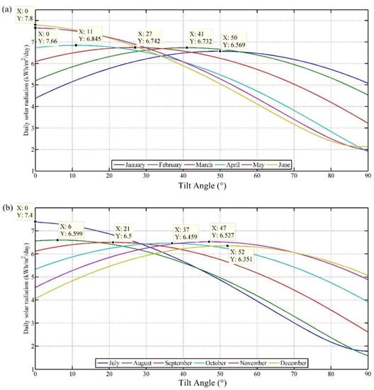 Monthly optimum tilt angle (a) January–June; (b) July–December.