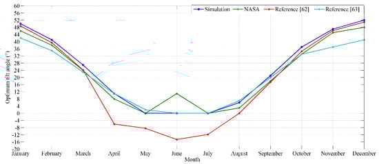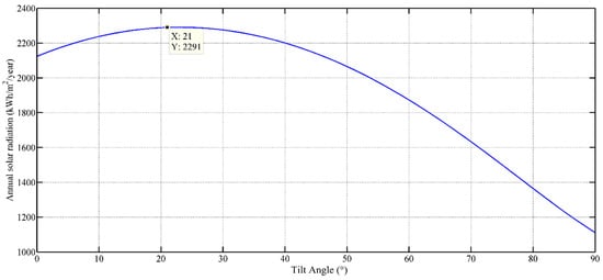 Tilt angle is one of the major factors that influences the PV module’s productivity. Based on an analysis of the average daily sum of GHI, the annual optimum tilt angle is determined and adopted in this study. Figure 7a,b presents the monthly optimum tilt angle from January to June and from July to December, respectively. Although the optimum tilt angle for each month is determined, solar radiation varies throughout the year because of the variation in sunray declination angle. It can be observed that the maximum solar radiation striking the PV modules occurs in the summer season (May to July) due to the sun’s path, which is orthogonal to the Earth’s surface during the summer season, and because of zero tilt angles, which reduce the PV modules’ self-shading. The obtained tilt angles are compared with the NASA data and the results of Kaddoura, reported in [], as well as the findings of [], as shown in Figure 8. Finally, the annual optimum tilt angle shown in Figure 9 is found to be 21°, which is close to Jeddah’s latitude (21.4858° N).