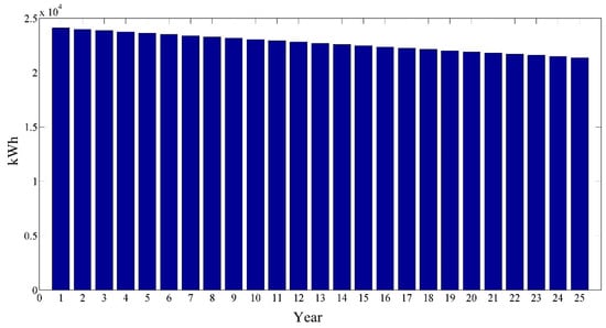 The simulation results indicate that the total monthly energy production over the first year varies between 2173.25 kWh in March and 1785.49 kWh in December. The total electric energy produced by the system in the first year is seen to be 23,589 kWh, with an average energy production of 1965.72 kWh/month. Figure 10 shows the monthly energy production of the system during the first year of operation. In comparison, the energy output in November and December (autumn season) and in January and February (winter season) are generally low due to cloudy weather in autumn and short sunshine periods and low solar irradiance in winter. High temperatures and soil losses due to dust accumulation do not have any appreciable effect on the energy yield in June.