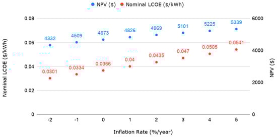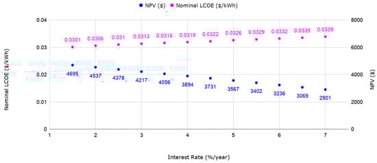 - The interest rate and inflation rate were analyzed. It was found that Saudi Arabia’s inflation rate fluctuated from 3.5% to −1.8% between 2016 and 2019, and LCOE was also subjected to inflation rate variation. The LCOE exceeds the electricity utility rate up to 0.0505 $/kWh at a 4% inflation rate. The Saudi Arabian interest rate for 12-month maturity was in the range of 7% to 3% between 1997 and 2019, and the analysis proves that the investment is economically feasible for this range of interest rates.