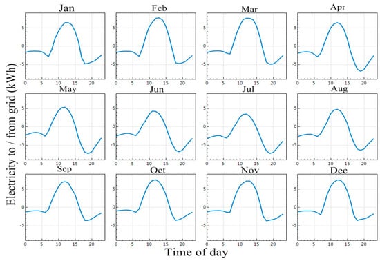 In Saudi Arabia, peak load demand occurs at midday on sunny days because of the wide use of air conditioners. Hence, the advantage of grid-connected PV system deployment plays an important role in relieving the distribution network, as the peak load demand coincides with the maximum solar radiation incidents []. In this case study, Figure 18 shows that the maximum energy injected into the utility grid always occurs during peak load demand hours, the negative sign power flow indicates that the energy flows from the utility grid to the customer, and vice versa. The time-of-use billing mechanism is investigated in this section to evaluate its preference over the current billing mechanism from the perspective of households.