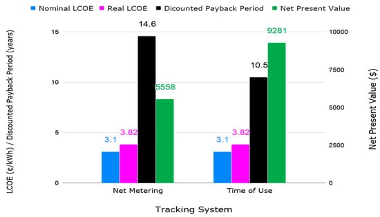 - The time-of-use billing (TOU) analysis revealed that the discounted payback period was decreased to nearly 10.5 years, while NPV was significantly increased to $9281, and LCOE remained unchanged. Hence, it can be inferred that the adoption of the TOU mechanism brings investors great economic benefit and, at the same time, can help in reducing the peak load demand.
