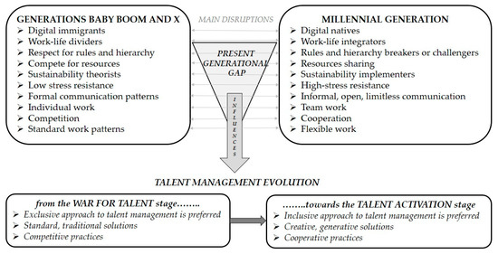In the new generational context, once the Millennial generation entered the workforce, the traditional relationship between employee and employer dramatically transformed [72]. As Cascio noted [9], because of the disruptive work expectations of the Millennials, the psychological contract between employer and employee was affected by significant changes, such as: uncertainty (before it was stability), temporariness (before it was permanence), flexible work (before there were standard work patterns), valuing performance and skills (before it was valuing loyalty), self-reliance (before it was paternalism), multiple careers (before it was linear career growth), lifelong learning (before it was one-time learning). In this context, traditional talent management practices must adapt to the dynamics of the new employer–employee relationship [72]. Because Millennials are rule-breakers and have very high stress resistance, it has been said that innovation is in their DNA; them being called “Millennovators” [73]. Organizations must keep up with them and implement creative, generative and cooperative solutions to activate talent/s because, in the new generational context, increasingly, traditional, standard and competitive solutions are no longer appropriate [13].