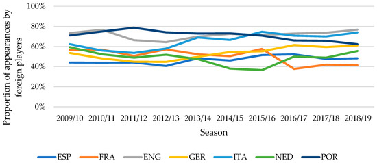 Football clubs in England were formed based on religious missions (Aston Villa—founded 1874) or on factories (Arsenal—founded 1886) [5] attributes the embracing of football by the working class at this time not only to its simplicity, but also to its ability to express a local sense of community, which had been lost in the movement from the rural environment to the amorphous mass of the city. This reflects the absolute absence of foreign players in English clubs at the time [5]. Later, in 2011/12 season of the Premier League (the top division of the English football league), English players accounted for just over a third of all appearances (37%), compared to just over two-thirds (69%) in the first season of the Premier League in 1992–1993 [6]. In the 2007/2008 season, the top ten highest goal scorers were already all foreign players, which means that foreign players brought quality to football in England [7]. Only 21 English players played in the 2014–2015 group stages of Champions League, despite there being four English teams (the highest number from country, together with Spain and Germany). The open market and presence of top foreign players has changed the culture of the English football league, which is now considered to be the best league in the world [6]. The expansion of Spanish sports clubs is also connected with foreigners. In Spain, modern sporting practices began to develop later than in other European countries—in the last quarter of the nineteenth century. The foundation of many Spanish clubs was closely associated with foreign professionals and specialists, who came to Spain to work in the industries before being part of the foundation of the clubs, which existed only as amateur clubs before this [8]. In Germany, the number of foreign players has grown over the years too. In the first German Bundesliga campaign (1963), there were just three foreign players. Forty years later, on the final day of the 2008 season’s Bundesliga campaign, the number was above 150 [7].